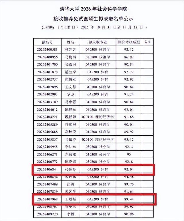 |        北京时间10月30日,中国名校清华大学社会科学学院,公布2026年接收推荐免试直硕生拟录取名单,国乒两位奥运冠军孙颖莎与王曼昱入围。