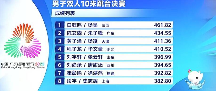 11月7日,第十五届全运会跳水男子双人10米跳台决赛进行。奥运冠军杨昊搭档白钰鸣,从第1跳开始就一路领先,最终两人以领先第2名近30分的优势为陕西队轻松摘得金牌,另一位奥运冠军陈艾森搭档朱子锋获得了银牌。