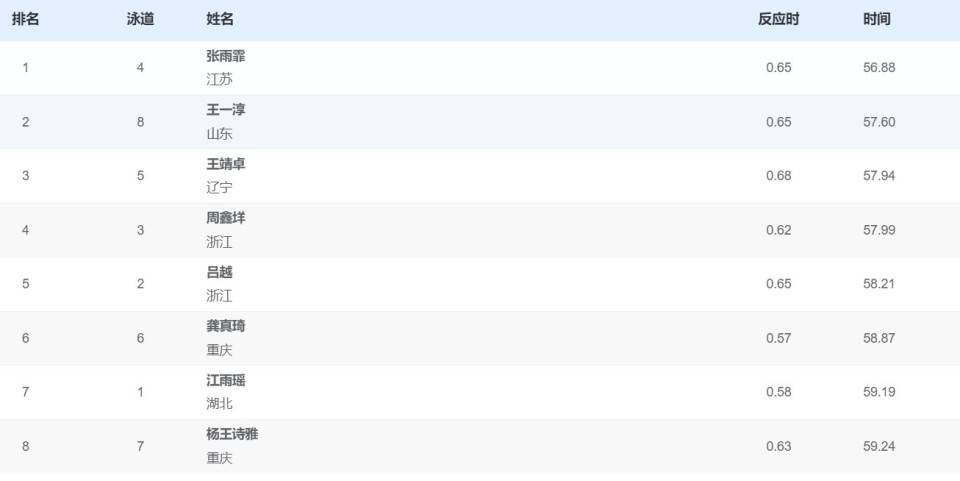 张雨霏以56秒88的成绩成功摘得金牌,王一淳57秒60的成绩获得了银牌,王靖卓57秒94刷新PB获得了铜牌。(全景体育) |