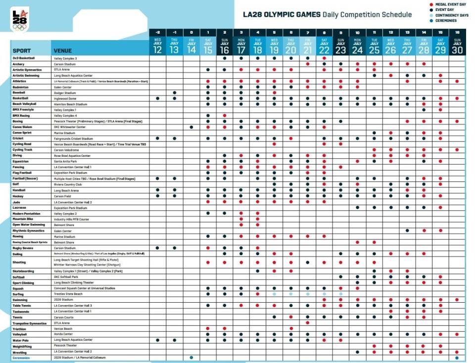 当地时间11月12日,洛杉矶奥运会官方公布了2028年奥运会详细赛程。2028年洛杉矶奥运会将是有史以来规模最大的一届奥运会,在洛杉矶和俄克拉荷马城的18个赛区49个场馆中举办51个大项。
