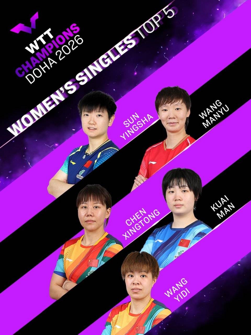 11月28日,WTT世界乒联公布了2026年多哈冠军赛的首批参赛名单。男子单打选手方面,世界排名第2位的林诗栋领衔参赛。女子单打阵容方面,孙颖莎、王曼昱等都将会亮相。 WTT多哈冠军赛男子单打报名截止时排名前5:林诗栋、雨果-卡尔德拉诺、张本智和、莫雷加德、费利科斯-勒布伦。 WTT多哈冠军赛女子单打报名截止时排名前5:孙颖莎、王曼昱、陈幸同、蒯曼、王艺迪。 除了上述公布的前5参赛名单之外,官网公布的其他男子单打参赛选手还有梁靖崑、松岛辉空、邱党、艾利克斯-勒布伦、向鹏。女子参赛选手还包括了张本美和、朱雨玲、伊藤美诚、陈熠以及早田希娜。 2026WTT多哈冠军赛将于1月7日到11日在卢赛尔体育馆举行,赛事总奖金额度为50万美元,本站冠军选手可以获得1000点世界排名积分。(全景体育)