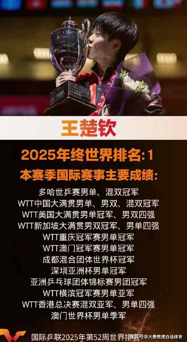 聚焦体坛资讯,关注赛场内外。 随着2025乒超联赛的结束,意味着国乒本赛季的所有比赛告一段落。 纵观整个2025赛季,国乒依然是当之无愧的乒坛霸主。 在樊振东和马龙、陈梦等奥运冠军远离国际赛场之际,在重大比赛里,孙颖莎、王楚钦、王曼昱等人,基本守住了大赛冠军。 尤其对于“一哥”王楚钦来说,巴黎奥运会止步32强、世界杯男单丢冠之后,身上的压力重如山,但求胜心强的大头还是坚持了下来,并以一个出色而成功的赛季结束。 当然,国乒目前面临的挑战还很多。 突出一点就是赛程密集而导致的顶尖球员伤情频出的问题。 帮助山东魏桥队拿到乒超男团冠军之后,王楚钦终于可以好好休息一下了。 在接受采访时,25岁的大头言语当中亦透露出些许的疲惫。 于是向国乒提出退出明年1月份的所有赛事,也就是包含多哈冠军赛在内的三站比赛。 几乎与此同时,国际乒联也是公布的2026年的巡回赛历。 从巡回赛历上能够看出,几乎每一个月的赛事都安排的满满当当。 即便是一名“劳模”球员,也很难保证全勤参与且不受伤。 所以在看到王楚钦和孙颖莎连续退出1月份的比赛之后,其实对于所有喜爱他们的球迷来说,无疑是长舒一口气的。 毕竟只有保证了身体健康,才能保证拿到好的成绩。 而在王楚钦退出明年一月份的比赛之后,国际乒联也是对于这位国乒“一哥”在2025赛季的表现有了充分肯定。 12月30日早上,WTT世界乒联官方写道: “世界排名第一,年终积分9925分。问鼎多哈,破界不止;冠冕加身,初心如刃…” 并且在配图上将王楚钦本年度所取得的主要成绩进行罗列。 可以看到,整个2025赛季,王楚钦光重量级的单打冠军就拿到了6个,冠绝男乒所有人。 更重要的是,在世界三大赛之一的世锦赛,王楚钦终于打破无冠历史,从而真正挑起国乒大梁。 出色的成绩后背是汗水的付出。 好成绩更需要肯定。 临近年底,各种颁奖评选活动非常多。 作为王楚钦一哥,又取得了太多的成绩,可以说拿奖拿到手发软。 这不,国内知名媒体《体坛周报》正式公布了2025年度“榜样的力量”获奖者。 这项评选中,乒乓球选手成功大赢家。 女单孙颖莎一枝独秀; 男单角逐中,王楚钦与樊振东两位顶尖高手的对话中笑到最后,荣获“年度最佳运动员奖”。 毕竟本赛季从对国乒的贡献上,大头的确更加当之无愧。 退出,是为了更好地复出。 明年一月份缺勤之后,王楚钦大概率会在2月份的亚洲杯上满血复活,届时一定会与国乒众将一起,继续捍卫国乒荣誉。 再次恭喜王楚钦,取得一个成功的2025赛季!(大秦壁虎白话体育)
