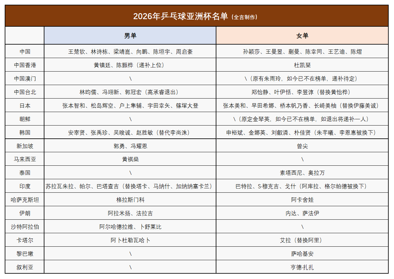 2026年1月6日,乒乓球海口亚洲杯名单正式出炉,根据亚洲乒联的官宣可知,国乒依旧维持此前获得邀请的运动员阵容,由男队的王楚钦、林诗栋、梁靖崑、向鹏、陈垣宇、周启豪与女队的孙颖莎、王曼昱、蒯曼、陈幸同、王艺迪、陈熠参赛,此前被猜测将获得提名的樊振东并未出战,日韩等外协会多人被换下,详细情况请看下文。