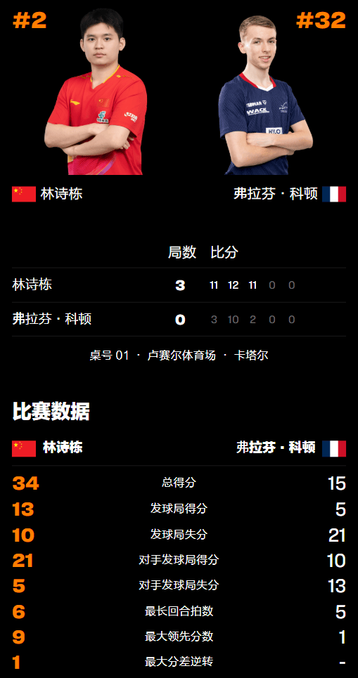 第三局林诗栋先得3分压制科顿,法国教练随即喊出暂停进行调整,但随后依旧不断失误丢分,林诗很快便以6-0、10-1领先并最终以11-2结束战斗,由此而强势锁定男单1/8决赛门票。