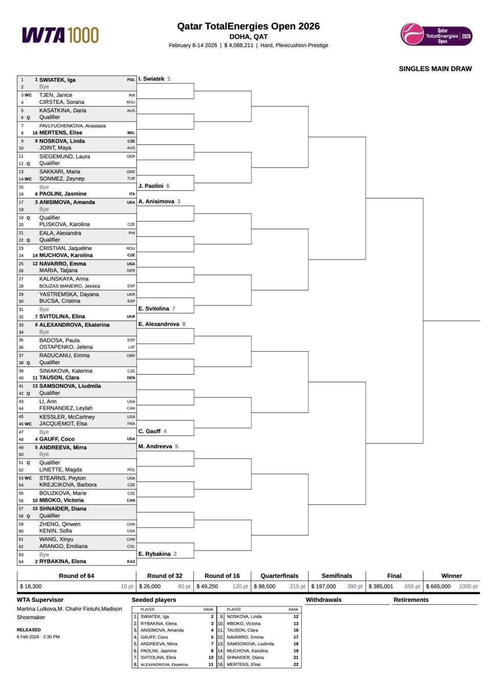 2月6日,WTA1000多哈站正赛抽签仪式进行。在退出了本周阿布扎比站的抽签之后,中国金花郑钦文终于出现在了多哈站的签表之列。如果一切顺利的话,郑钦文将于周日或周一迎来自己的赛季首秀。 郑钦文在首轮比赛的对手,将是前澳网冠军得主肯宁。两人在2024年东京站决赛曾有过一次交手,当时郑钦文两盘战胜对手,成功拿下了冠军。肯宁目前排名世界第28位,在不久前的澳网她止步首轮。 如果能够在首轮取胜的话,郑钦文在第2轮比赛的对手,将是15号种子施耐德和一位资格赛球员之间的胜者。而如果能够闯入第3轮比赛的话,郑钦文可能会面对新科澳网冠军、赛会2号种子莱巴金娜。 另一位参赛的中国球员王欣瑜,将在首轮对阵阿朗戈。如果能够在首轮取胜的话,王欣瑜第2轮的对手将是今年的澳网冠军莱巴金娜。如果她能够在第2轮击败莱巴金娜的话,在第3轮有望同郑钦文实现会师。 赛会前8号种子在首轮比赛享受轮空待遇,前8号种子的对位情况如下: 【1】斯瓦泰克VS【6】鲍里妮 【3】阿尼西莫娃VS【7】斯维托丽娜 【8】亚历山德罗娃VS【4】高芙 【5】安德列娃VS【2】莱巴金娜。(全景体育) |