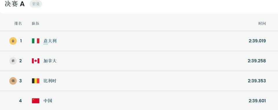2月10日,米兰-科尔蒂纳冬奥会进入第4比赛日的角逐。短道速滑项目在这一比赛日开赛,混合团体接力决赛,决出了短道速滑的首枚金牌。中国队在前半程占据第一的情况下,后程被接连超越,最终以第4名的成绩完赛,遗憾无缘领奖台。 【1/4决赛回顾】 中国队在此前的1/4决赛比赛中,在第3组滑出了2分39秒193的成绩,排名小组第2位,Q进入到了半决赛。 半决赛中国队滑出了2分38秒375的成绩,排名小组第2位进入到了最后的A组决赛。 【决赛表现】 决赛中国队派出的4位参赛选手分别是公俐、张楚桐、刘少昂和孙龙。比赛第1棒张楚桐滑得非常出色,迅速占据了领滑的位置。比赛还剩最后7圈时,张楚桐被意大利队超越,中国队掉到了第2的位置。比赛还剩最后4圈时,孙龙在弯道略微出现失误,中国队排名降到了第4位。此后中国队尽管拼命追赶,但仍旧未能提升名次。 【最终成绩】 意大利队以2分39秒019的成绩获得金牌,加拿大队2分39秒258获得了银牌,比利时队2分39秒353获得了铜牌,中国队2分39秒601排名第4位,遗憾无缘领奖台。 值得一提的是,在此前的B组决赛中,荷兰队以2分35秒537的成绩创造了新的奥运会纪录。(全景体育)