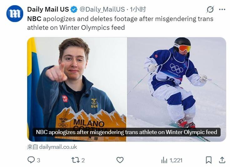 我可以参加女性项目比赛,但你不能称呼我为女性!现实往往比讽刺小说家的故事更加讽刺。这一幕发生在米兰冬奥会期间,NBC在转播冬奥会自由式滑雪女子雪上技巧项目期间,因为用“她(she)”称呼一位跨性别运动员,NBC遭到了众多跨性别人士攻击,不得不删除该比赛视频回放并进行道歉。 这位跨性别运动员名叫伦德霍姆,他是冬奥会历史上首位公开的跨性别参赛选手。伦德霍姆认为自己是男人,但是他符合冬奥会的女子组参赛资格——没有服用睾酮、没有进行性别手术。他只是一个把头发剪短、穿宽松衣服的自认为是男人的女人。 在伦德霍姆参加女子雪上技巧比赛时,NBC犯了一个“严重的错误”——把一个正在参加女子项目竞争的女人称呼为“她”。 视频遭到了众多跨性别人士的反对,NBC不得不紧急删除了该视频,并发表声明进行道歉。 “今天我们转播了一个由非NBC Universal评论员解说的国际信号,他们对奥运选手埃利斯-伦德霍姆使用了错误的性别称呼。我们向埃利斯和观众道歉,并已经删除了该视频回放。” 值得一提的是,伦德霍姆在资格赛第1轮的比赛中,排名30位参赛选手第29位,仅仅比一位弃权的选手排名更高。第2轮比赛尽管他的成绩得到了提升,但最终排名第25位,未能进入到决赛。(全景体育)