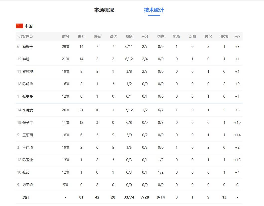中国队最大功臣必然就是李月汝,斩获全场最高的21分,11个篮板,1个助攻,命中一记三分,投篮命中率超过50%,下半场爆发出来。