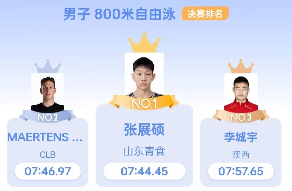 3月22日,中国游泳公开赛暨全国春季游泳锦标赛迎来收官之日。在男子800米自由泳决赛的比赛当中,张展硕在最后50米发力冲刺,甩开了400米世界纪录保持者马腾斯,以7分44秒45的成绩刷新PB夺冠,拿下了个人本届赛事第4金。 【各项纪录】 世界纪录:7分32秒12——张琳(中国) 亚洲纪录:7分32秒12——张琳(中国) 全国纪录:7分32秒12——张琳(中国) 【决赛表现】 决赛张展硕在第5泳道出发,他身旁第4泳道的是400米自由泳世界纪录保持者马腾斯,本场比赛的争夺主要在这两位选手之间展开。 第1个50米张展硕和马腾斯几乎是同时完成转身,100米两人仍旧是齐头并进,张展硕略微落后约0.4秒。200米、300米、400米、500米张展硕仍旧紧追马腾斯。550米转身过后,张展硕实现了对马腾斯的反超。游程进入到最后50米,张展硕开始提速,双方的差距逐渐拉开。最终张展硕以领先超过2秒的优势率先触壁完赛,马腾斯紧随其后到达。 【最终成绩】 张展硕以7分44秒45的成绩拿到了冠军,马腾斯7分46秒97获得了亚军,李城宇7分57秒65获得了季军。潘展乐在上午的慢组比赛游出7分57秒92的成绩排名第4位。(全景体育) |