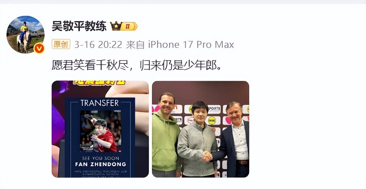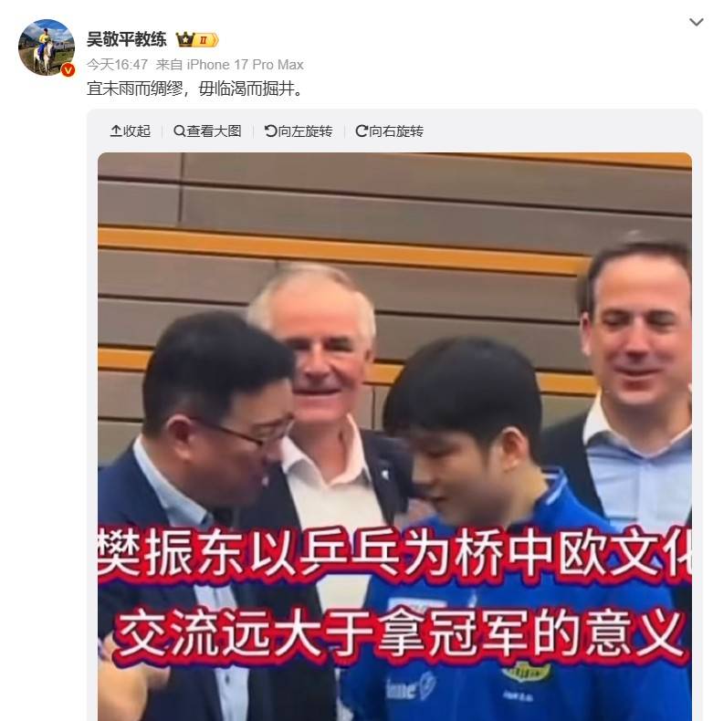 樊振东和陈梦都是巴黎奥运会的单打冠军,两人也都退出了世界排名,不过离开国际赛场后的道路不一样,樊振东相对还是参加更多一些比赛,比如乒超、德甲,近期出现转会的动态。 相比之下,中国网友更关心的是樊振东是否还会回归国乒,一直都是各种猜测,甚至所有人都在替樊振东发声,唯独他保持沉默,奥恰洛夫说樊振东一定会缺席伦敦百年世乒赛。波尔称樊振东没有接到归队通知,不知道他能否归队! 王励勤表示正在与樊振东本人沟通,可樊振东本人自始至终一言未发。网络大咖马继华公开指责樊振东制造悬念,制造矛盾,到底回来不回来一句话的事。 樊振东不是沉默,不是摆姿态,而是最负责任的选择,他深知自己的一字一句都会被无限放大,不愿给教练组添麻烦,便独自扛下所有误解和重压,在海外赛场坚持热爱,把乒乓球的影响力推向更高。 樊振东的恩师吴敬平发布了樊振东近期所有热点,12个字:宜未雨而绸缪,毋临渴而掘井。意思是比喻事情要早作准备,不要事到临头才想办法,刚硬国乒,目前还不早做决定,就来不及。 虽然目前国乒还没有正式公布伦敦世乒赛的参赛名单,因为还需要最后一次队内选拔,樊振东就已经直通了,不需要通过其他条例,凭借去年全运会夺冠直接入围,但正如上面说的,国乒看似很看重樊振东,而樊振东始终没有表态,也有指出樊振东回不回,都是国乒说了算。 吴敬平曾在国乒担任了数十年的教练,自然会清楚内部情况,必然还是需要国乒去召回樊振东。 不少外协会运动员在采访,表示国乒男团这次世乒赛是新世纪以来夺冠最艰难的一次,认为能否夺冠,取决于王楚钦能否拿2分。 吴敬平一直也在关注国乒运动员的表现,深知只依靠王楚钦一人是不够的,团体赛更需要队伍的力量,现在梁靖崑、林诗栋都有伤在身,状态下滑,周启豪上升很快,但大赛能否发挥出来,是一个未知数,其他小将有希望打上来,不管是谁,稳定性也是一个问题。 说到底还是需要樊振东,就为何发布那12个字,到时若丢冠就后悔来不及了,国乒后面剩下的名额,就是通过选拔赛成绩、以及综合考虑备战、战绩等因素,整个考虑的范围比较大。 也对弟子樊振东转会德甲俱乐部杜塞尔多夫的深意寄语,延续了他长期以诗词化表达守护弟子职业生涯的独特风格。 并且附了6张樊振东的相片,有的配上文字,为中欧文化的交流搭建桥梁,已经远超于胜负之外。最后一张相片更是配上双重字“脊梁”,似乎不断在强调,而且樊振东还是穿国乒的比赛服。 吴敬平在樊振东官宣转会德甲豪门杜塞尔多夫后连发多条动态:3月16日晒出樊振东与中国驻法兰克福总领事在训练场的合影,配文"娘家人来了",强调祖国对海外运动员的支持;以古典诗词"愿君笑看千秋尽,归来仍是少年郎"寄语弟子,勉励其保持初心。 吴敬平多次分析樊振东留洋后的技术突破:指出其反手发球抢攻战术借鉴了欧洲球员的"反手体系",通过德甲联赛取长补短,并在全运会中成功运用该技术。 强调樊振东的统治级表现(德甲胜率92%)带动萨尔布吕肯俱乐部赞助商从10家增至64家,印证其国际影响力。 近日樊振东以MLB中国区冠军荣耀大使身份空降美国迈阿密,现场见证了2026年世界棒球经典赛决赛中委内瑞拉队史首次夺冠的历史性时刻。这是他继2025年赴东京巨蛋观看MLB揭幕战后,再次跨界支持国际顶级棒球赛事。 樊振东全程坐在本垒后方的核心观赛区,沉浸式感受比赛氛围,并在赛后通过社媒分享现场动态。 樊振东身着印有赛事标识的灰色连帽衫或休闲卫衣,专注观赛时被镜头捕捉到自然流露的兴奋神情,与观众互动毫无冠军架子。网友形容其“圆脑袋可爱”“萌袖小咚”,赛场下的松弛感与乒坛沉稳形象形成反差。(知轩体育)