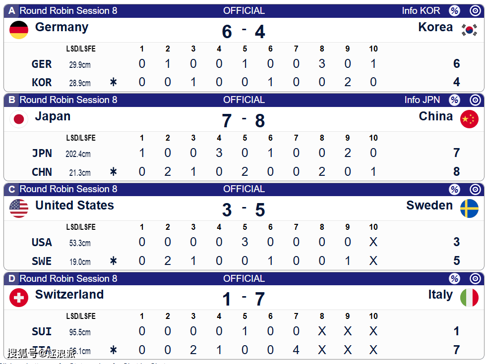 其余比赛,德国6-4韩国、美国3-5瑞典、瑞士1-7意大利。