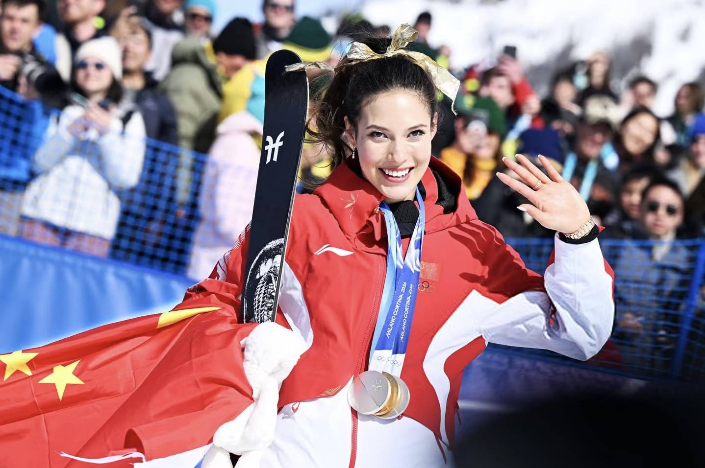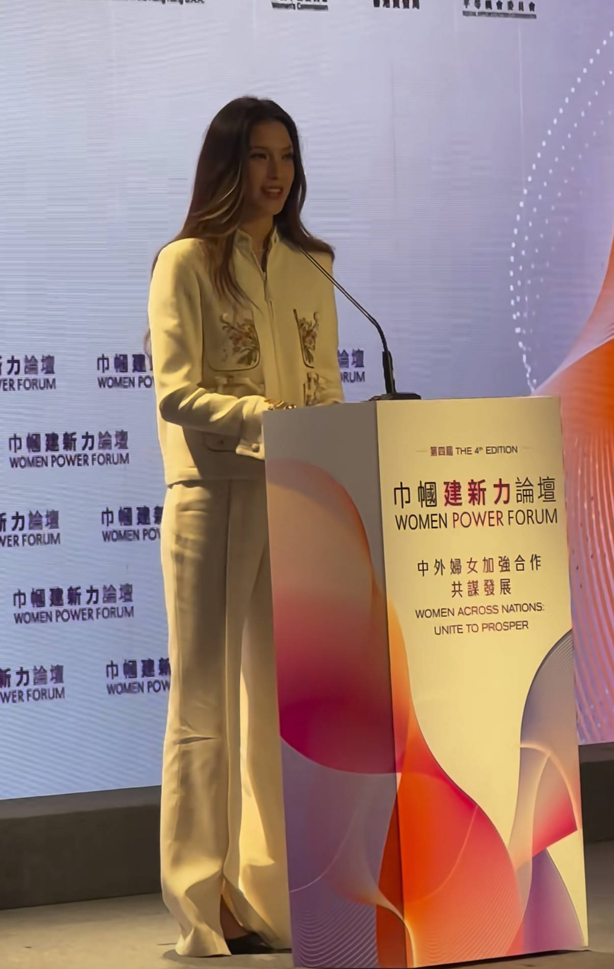 18岁在北京冬奥会夺冠,拿下2金1银的成绩,成为中国最年轻的冬奥会金牌得主、冬奥会历史上最年轻的自由式滑雪金牌得主。 她还以几乎满分的成绩考入斯坦福大学,成为网友口中的“天才少女”。同时还是全球顶奢品牌代言人,多次亮相巴黎时装周,Met Gala等顶级时尚场合。 4月1日,谷爱凌现身香港参加巾帼建新力论坛,这次活动的主办方是香港各界妇女联合协进会,由何超琼牵线主办。 谷爱凌晒出自己参加论坛时的合影,何超琼一身黑色套裙站在谷爱凌身侧,郭晶晶黑裙+豆绿色西服很温婉,谷爱凌一身白色套装尽显中式典雅。 谷爱凌175cm的身高,在人群中很惹眼。一身白色套裙,更是清丽雅致。这次谷爱凌的造型,更偏向东方婉约气质。 一头披肩长发,发尾的位置是比较自然的卷度,那种慵懒自然的状态很让人喜欢。虽然她是混血长相,但骨子里的东方美韵挡不住。 这次谷爱凌的妆容,也适当的掩盖了她的欧美气质。淡雅清秀的妆容,就如同出水芙蓉一般。她鼻梁高挺、五官轮廓立体分明,辨识度很高。 在上台演讲的时候,谷爱凌更是全程中英文切换,自己给自己翻译。原来自信从容的谷爱凌,是足够强大才拥有底气。 谷爱凌的白色套装,融入了以刺绣为主的东方元素。口袋上的刺绣元素精致婉约,是细节里的审美、更是骨子里的爱国情怀。 本就拥有顶级美貌的谷爱凌,一身白色套装更是清丽醒目。袖口的刺绣、小V形的领口,让简单的穿搭更具细节美。 谷爱凌这组穿搭以“新中式+轻小香风+东方刺绣”为主题元素,整体的白色调端庄大气、典雅又更加年轻化,在这种高端论坛、完全压得住场面。 相对于何超琼、郭晶晶这种顶级大咖,谷爱凌相对年轻,穿搭也更适合这种浅色系。白色系显肤色、也显气质,视觉属性更加优雅。 谷爱凌高鼻深眼的张扬,在日常中更适合英气高级国际范穿搭。上扬的嘴角柔和的面部线条更显亲和阳光,有感染力的立体骨相,舒展的轮廓更加大气。 新中式套装穿在她身上,尽显东方婉约美。尤其是微卷的长发,增添了女性的柔和之美。这样的穿搭不张扬,更内敛雅致。 除了谷爱凌的穿搭,更多的是被她的才华、胸襟所感动。 她说22岁的年纪,不要总问我会不会退休。我还年轻,还能滑。在谷爱凌心里,滑雪是兴趣、是爱好,也是自己喜欢的事业。 谷爱凌属于那种多栖发展的女孩,体育、时尚、公益领域,都能看到她的影子。而且谷爱凌对各项事业并没有偏颇,都是一视同仁的炙热。 从这个场子赶到那个场子,可以做到自由的状态切换。秀场上时髦的礼服,烫着大波浪的卷发,举手投足皆是风情。 不少网友都说,谷爱凌的长相是遗传了爸爸。其实看她家三代的女性合影,才明白谷爱凌的长相完全是遗传了外婆(奶奶)。 谷爱凌从小就是由外婆带大,他们家里都觉得喊奶奶比较亲近,谷爱凌就一直喊外婆为奶奶,都是很开明的一家人。 遗憾的是,谷爱凌在2026年参加冬奥会期间,她的奶奶去世了。因为谷爱凌正在比赛,家人都没有告诉她,也错过了和奶奶最后一次见面。 有时候真的是“世事两难全”,谷爱凌看似闪耀的人生里、也藏着不为人知的心酸。不过谷爱凌已经很厉害了,她的成绩也是有目共睹的。(小疯说时尚)