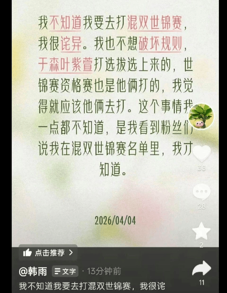 然而,这样的一位实力很强的国家队队长,却在今天发声,表示自己有可能要被封杀了,甚至还有可能就此退役。“我不知道我要去打混双世锦赛,我很诧异。我也不想破坏规则,于森、叶紫萱打选拔选上来的,世锦赛资格赛也是他俩打的,我觉得就应该他俩去打。这个事情我一点都不知道,是我看到粉丝们说我在混双世锦赛名单里,我才知道。”