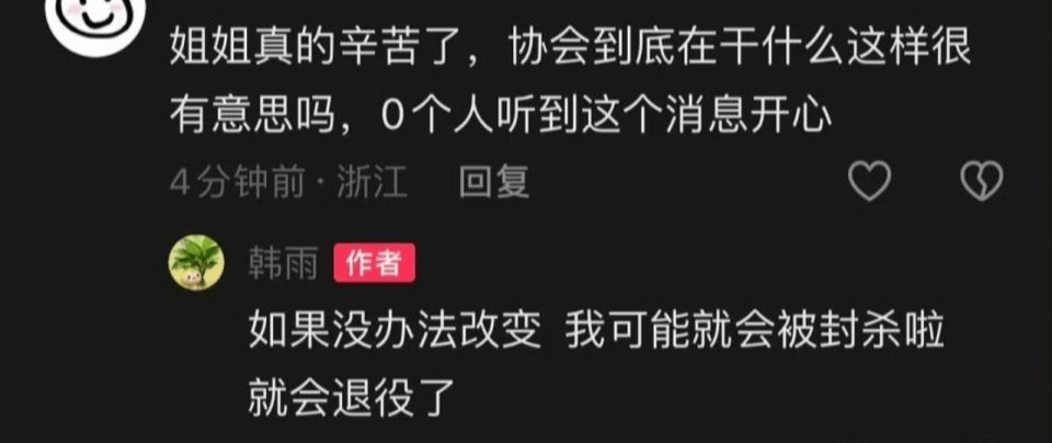 从韩雨的这段话里,可以看到队内让她去打混双世锦赛,但是她自己并不知道这件事。最重要的是,队内有混双组合于森和叶紫萱,并且他们俩是一直打选拔赛上来的,而且这个世锦赛的资格也是他们拿下来的。因此,韩雨认为,就应该由于森和叶紫萱去打。韩雨接着表示:“我不会去混双世锦赛,我支持于、叶去。”当有网友对协会的这个选择进行质疑时,韩雨更是表示“如果没办法改变,我可能就会被封杀啦,就会退役了。”另外,值得一提的是,从官方的混双世锦赛名单来看,韩雨确实是出现在中国队的参赛名单中,而叶紫萱的名字则不在里面。(体育晨语) |