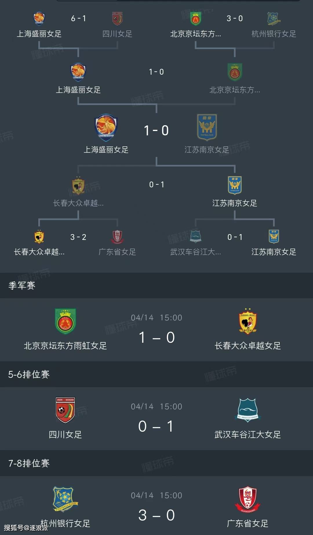 北京女足首战3-0河北,次战3-1西海岸,末战3-1广东,淘汰赛3-0杭州,上轮0-1不敌上海。长春女足首战2-0拿下中国国少女足,1-1战平四川,3-0轻取重庆,之后3-2险胜广东,0-1不敌江苏。