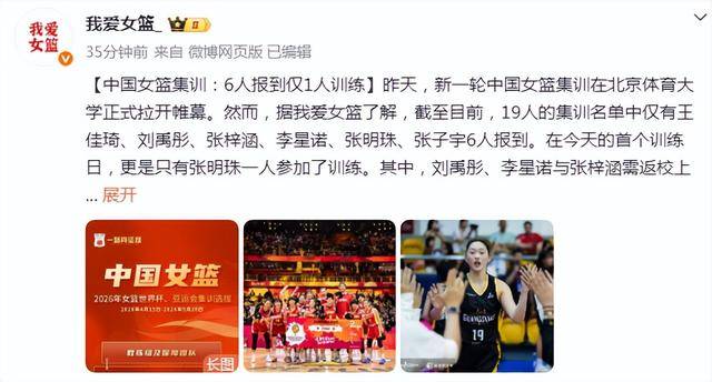 北京时间4月16日,中国篮协此前公布了中国女篮的19人集训名单,如今根据媒体人我爱女篮报道,目前只有张子宇与刘禹彤等6人报到,且首日仅有张明珠一人参加训练。