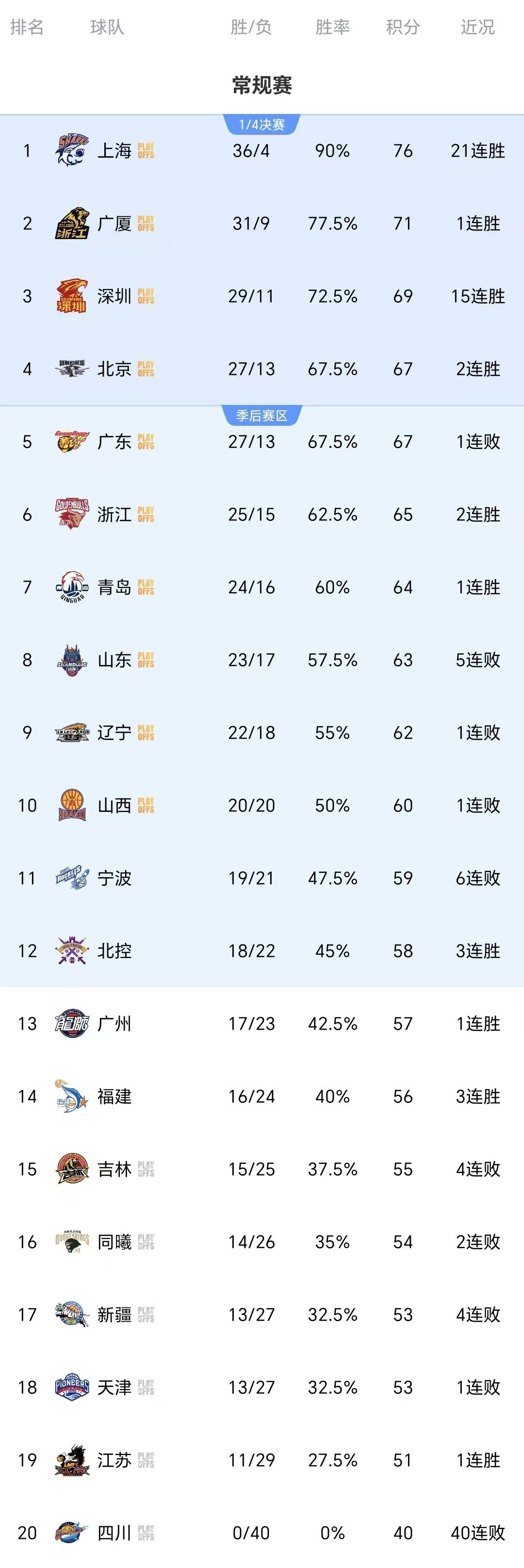 北京时间4月18日,2025-2026赛季CBA常规赛第40轮中,福建晋江文旅男篮客场以95-83爆冷击败传统劲旅广东东阳光男篮,终结自身连败的同时,送对手主场收官战失利。江苏肯帝亚1分绝杀山西汾酒,广州和辽宁都取得胜利。 广东东阳光83-95福建晋江文旅 广东东阳光半场以53-43领先10分,但第三节被福建单节追回10分(昆汀·皮特森独得15分),末节福建再度打出26-14攻势锁定胜局。 福建全场利用快速反击和外线投射压制对手,广东下半场进攻效率骤降,最终以12分差距告负。福建的昆汀·皮特森砍下39分6篮板7助攻3抢断的全面数据,末节独得15分主导逆转。 邹阳贡献20分10篮板,新秀状元杨曦皓拿下12分7篮板3盖帽,攻防两端均展现价值。广东外援奎因空砍31分9篮板5助攻,但本土球员仅徐杰得分上双(13分),全队末节仅得14分。 此战为广东常规赛最后一个主场,失利后以20胜6负的主场战绩收官,但整体仍以37胜15负暂居积分榜第7位。 江苏肯帝亚87-86山西汾酒 双方全程比分紧咬,江苏队在落后局面下多次迫近分差。半场结束后山西曾短暂领先,但江苏下半场通过高强度防守和篮板拼抢扭转局势。 末节江苏一度将分差缩小至1分,并在最后阶段依靠关键防守锁定胜局。山西队末节进攻效率下降,未能实现反超。 庞峥麟贡献稳定组织与高效得分,全场多次串联进攻,本赛季场均16.5分+5.4助攻。外援贾尔斯发挥内线支柱作用,凭借强硬篮板争抢和篮下终结能力牵制山西防守,本赛季场均18.9分+9.2篮板。 迪亚洛砍下高分(具体本场数据未公开),本赛季场均19.4分+6.0篮板,但末节未能延续强势。原帅三分球8投未中,错失超越王仕鹏历史三分榜排名的机会(赛前距王仕鹏仅差3球)。 长白山恩都里75-93广州朗肽海本 广州队从首节便掌握主动权,袁照耀、徐昕篮下连续得分建立优势,次节陈国豪三分命中扩大分差至10分。下半场霍勒迪连得9分奠定胜局,最终广州以18分优势获胜。 伯顿21分9篮板,霍勒迪13分6篮板,袁照耀12分,陈国豪10分,四人得分上双展现团队火力。长白山恩都里内线薄弱问题突出,外线命中率低迷。 凭借徐昕的篮下统治力(本赛季场均12.6分8篮板)压制长白山内线,同时末节提速攻势针对对手失误短板。历史交锋近10场广州胜率达60%,本赛季双杀对手(此前主场87:74取胜)。此胜后战绩提升至17胜23负,保留晋级希望。 辽宁本钢71-76浙江稠州金租 首节:24-24(辽宁开局6-0领先,浙江外线追平),次节:22-19(浙江靠三分反超,半场46-43领先),三节:17-19(辽宁追至62-63,分差仅1分),末节:21-14(浙江内线约翰逊连得7分拉开分差,辽宁最后2分钟追至74-75,但罚球锁定胜局)。 浙江大外援达卡里·约翰逊砍下18分16篮板(含7个前场篮板),末节连得7分主导攻势,二次进攻得分远超辽宁。 浙江全场篮板46-38碾压辽宁,前场篮板17-11领先,创造更多二次进攻机会。浙江三分球33中11(命中率33.3%),程帅澎独中4记三分贡献18分;辽宁三分仅23中5(命中率21.7%),赵继伟三分5投0中。浙江防守端锁死辽宁外线,迫使赵继伟11投仅2中得6分,王岚嵚5投1中,后卫线合计16中3。(知轩体育)