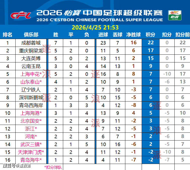 目前积分榜上,青岛海牛、天津津门虎继续负分位居倒数两名,川渝携手申花保持不败,海港、国安、浙江、泰山状态也不稳定,不算扣分的话,只有5队积分破十,其余11队积分只差5分且都在5-10分之间,实力接近。算上扣分,则成都19分、重庆17分双双不败领跑,大连豪取五连胜后积15分稳居第三,剩余球队都在个位数。(逐浪派)